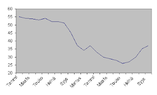 Kielenkäytön lisäksi talousuutisoinnissa on mielestäni melko kyseenalaista, miten paljon tässäkin suhdannetilanteessa halutaan tyypillisesti korostaa juuri vuosimuutoksia. Ei ole ihme, että viime syksynä tapahtuneen maailmanlaajuisen taloudellisen täysseisahduksen jäljiltä ollaan kuukaudesta toiseen huomattavasti edellistä vuotta alempana. Nyt, kun ollaan kuitenkin päästy jo Lehman Brothersin konkurssin vuosipäivään asti, ja taloudessa on vieläpä nähty orastavia merkkejä positiivisesta käänteestä, voidaankin pian odottaa huomattavasti miellyttävämmännäköisiä vuosimuutosprosentteja. Suuri osa tästä johtuu kuitenkin vain siitä, että vuodentakaiset luvutkin ovat tällöin alhaisia. En ole koulutukseni puolesta millään tapaa talouden asiantuntija, mutta eivätkö suhdannevaihtelujen vaikutukset talouslukuihin olekin huomattavasti sesonkivaihteluja suuremmat? Eikö siksi tällaisina aikoina tulisikin keskittyä enemmän suhdannehuippuun vertaamiseen sekä kuukausimuutoksiin jatkuvan vuosimuutosten toistamisen sijaan?